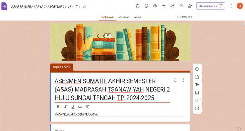 Barabai (MTsN 2 HST) – Kepala Madrasah Tsanawiyah Negeri (MTsN) 2 Hulu Sungai Tengah (HST), Drs. H. Imansyah meminta serta menghimbau kepada pendidik di lingkungannya agar segera melengkapi atau merampungkan soal untuk persiapan Asesmen Sumatif Akhir Semester (ASAS) Genap Tahun Ajaran 2024/2025 yang akan dilaksanakan mulai tanggal 26 Mei 2025 nanti..Imansyah mengungkapkan dirinya mengatakan dengan lengkapnya soal persiapan ASAS 2025 untuk kelas 7 dan 8 maka operator akan juga akan siap mengolahnya ke dalam Google Form yang akan ditampilkan pada pelaksanaan nanti..
