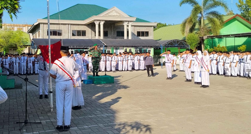 Barabai (MTsN 2 HST) – Pelaksanaan upacara bendera pada Senin (13/10/25) di lapangan utama MTsN 2 Hulu Sungai Tengah (HST) berlangsung semangat dan berbeda hari-hari sebelumnya yaitu dengan diberikannya amanat pembina upacara dari Danramil 1002-06/Barabai Kapten Inf Suban memberikan penguatan serta motivasi kepada para siswa tentang literasi sebagai penyongsong kemajuan bangsa